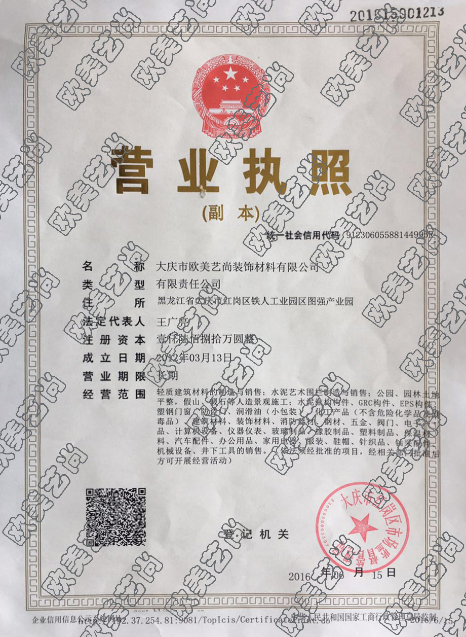 大慶市歐美藝尚裝飾材料有限公司始建于2004年,2006年在大慶成立大慶分公司,2007年在滿(mǎn)洲里成立分公司,2012年4月改名為大慶市歐美藝尚裝飾材料有限公司,F(xiàn)北京,吉林,黑龍江,內(nèi)蒙古都由專(zhuān)業(yè)的施工生產(chǎn)施工的工地,現(xiàn)本公司在大慶占地面積50000平米,專(zhuān)業(yè)技術(shù)人員80余人,專(zhuān)業(yè)從事GRC建筑裝飾材料以及多種新型建筑建筑裝飾材料的 研發(fā)生產(chǎn)和銷(xiāo)售,本公司經(jīng)營(yíng)主要產(chǎn)品有GRC水泥構(gòu)件,EPS成品構(gòu)件,GRC歐式構(gòu)件,仿木制品,圍欄系列,河堤系列,長(zhǎng)廊系列 ,涼亭系列,圓雕浮雕系列,玻璃鋼制品,仿砂巖制品 ,仿 漢白玉,仿石質(zhì)品,廣泛用于新舊建筑物內(nèi)外裝飾,園林景觀(guān),藝術(shù)壁畫(huà)等 相關(guān)項(xiàng)目 。